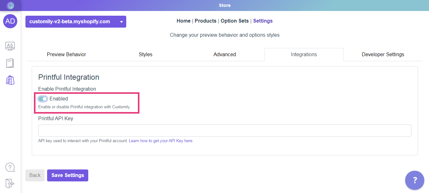 4. Click to Enable the Printful Integration.