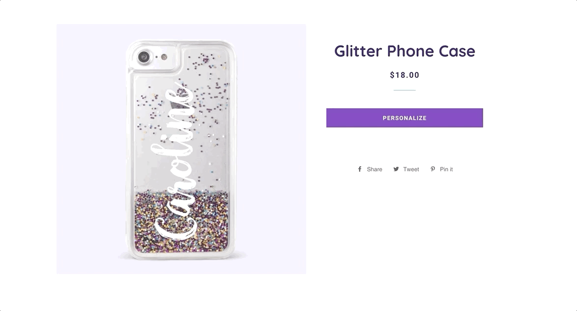A Personalize button is added to the product page. When customers click the Personalize button, a modal opens displaying the preview and personalization options.