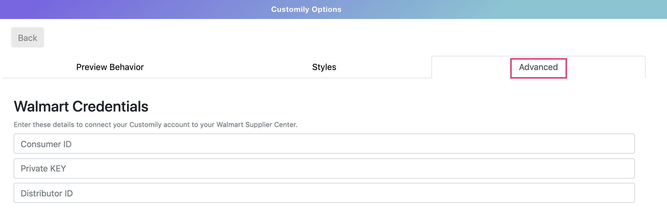 - Fill in the information under Walmart Credentials